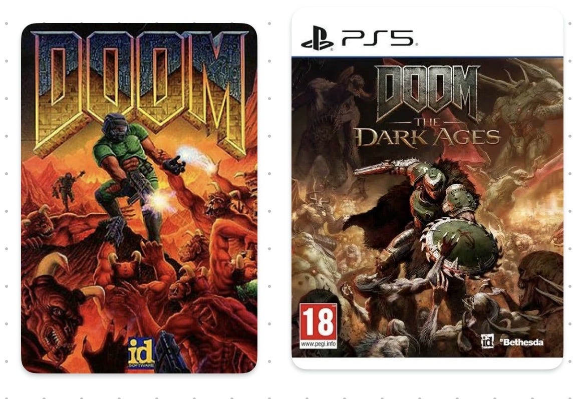 Vidíte tu podobu? Doom 1 a Doom: The Dark Ages se trochu podobají obalem — Doom Slayer stojí nad skupinkou démonů a patřičně je trestá.
